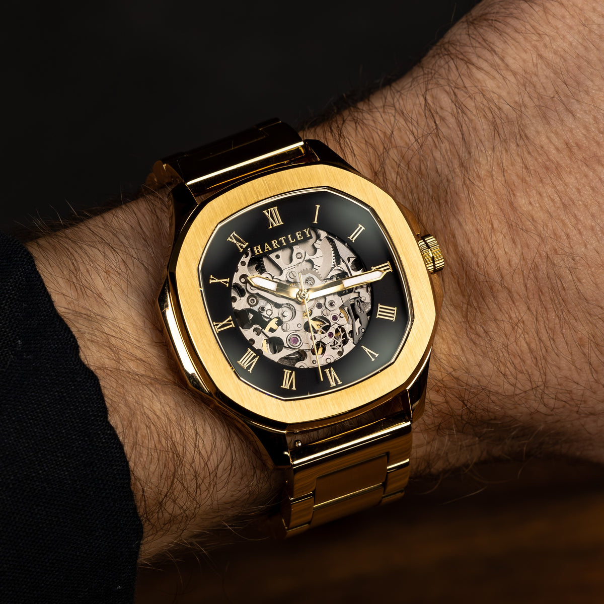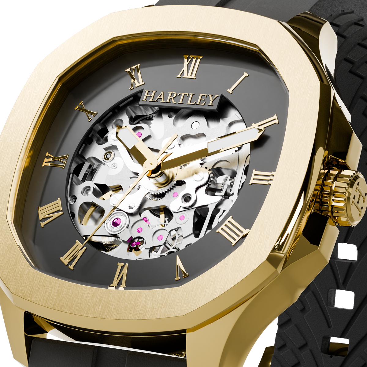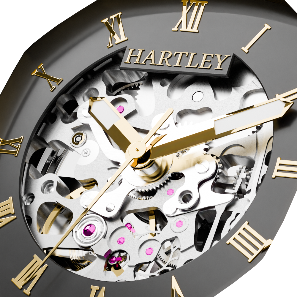 This stunning watch is intricately designed to showcase its mesmerizing automatic mechanical movement. With its refined black case and black crocodile embossed Italian leather strap featuring a butterfly clasp, it adds a touch of class to any sophisticated occasion.